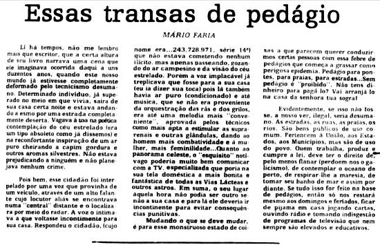 Escritor, poeta, professor e advogado, Mário Faria colaborou ativamente na Imprensa santista, escrevendo principalmente sobre temas de Direito Internacional. O artigo "Essas transas de pedágio" foi publicado no jornal santista A Tribuna em 24/3/1977, página 2: