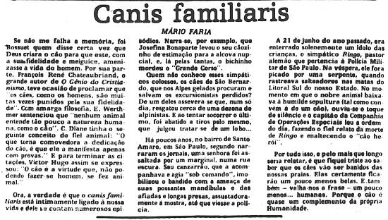 Artigo "Canis Familiaris", publicado em A Tribuna em 23/7/1977, página 2: