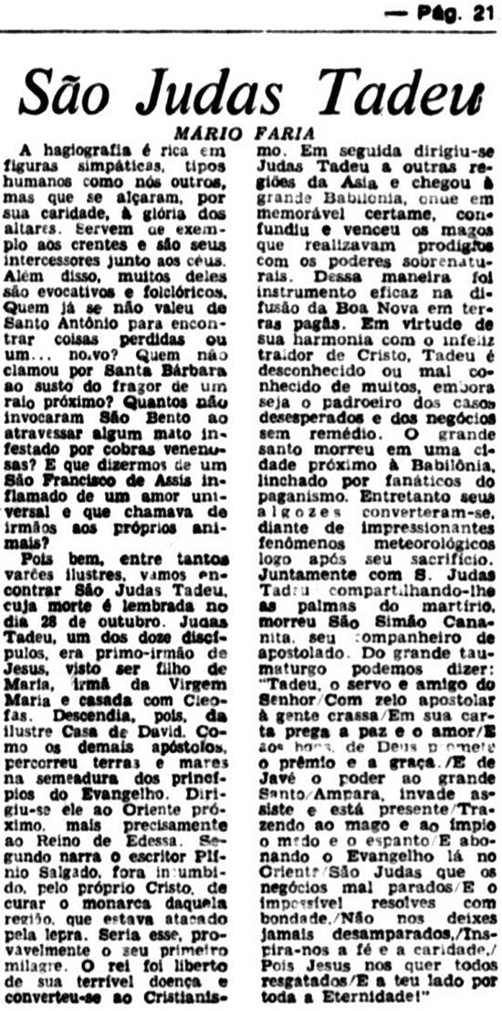 Artigo "São Judas Tadeu", publicado em A Tribuna em 20/10/1977, página 21: