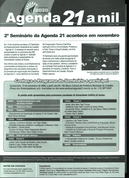 Registros do 2º Seminário de Desenvolvimento Sustentável de Cubatão - Agenda 21, ocorrido no dia 13 de novembro de 2008 no