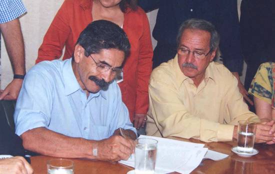 Assinatura do contrato para remoção dos moradores da favela Jardim São Marcos, pelo então ministro das Cidades, Olívio Dutra, tendo ao lado o prefeito Clermont Castor, em 27/3/2004