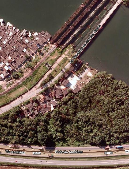Vila Pelicas, com a ferrovia acima, a Via Anchieta abaixo e o Rio Casqueiro à direita