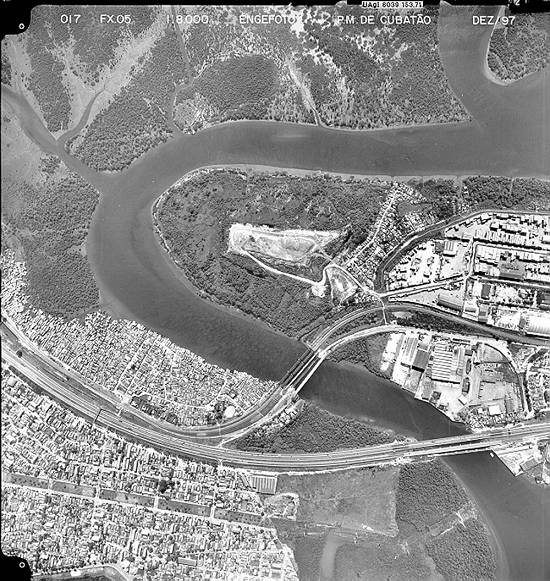 Casqueiro em 2002, destacando-se ainda o Rio Casqueiro e o aterro do lixão da Alemoa, já em terras de Santos