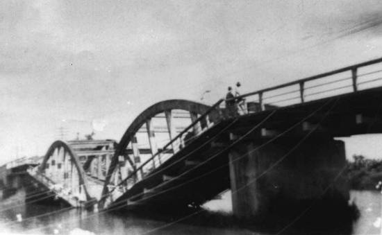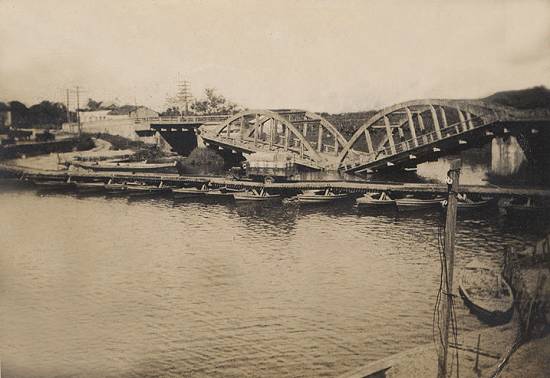 Em 1935, uma ponte provisória era formada com chatas, notando-se na imagem a travessia