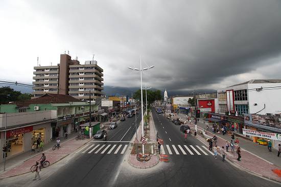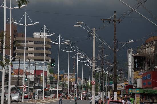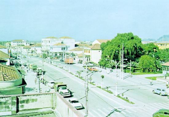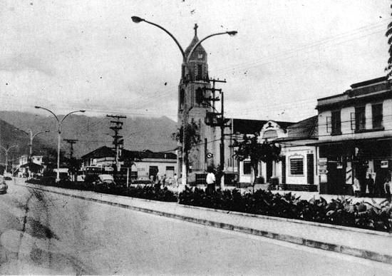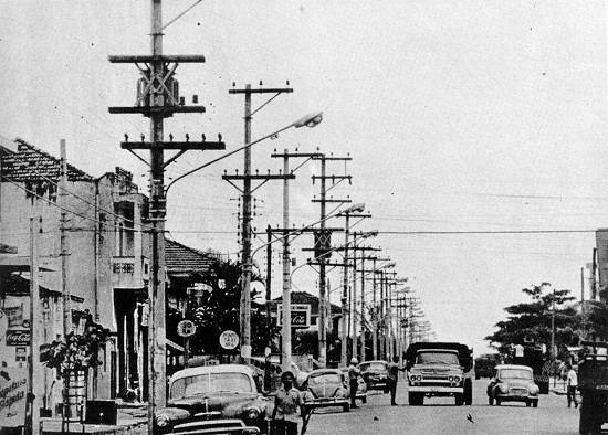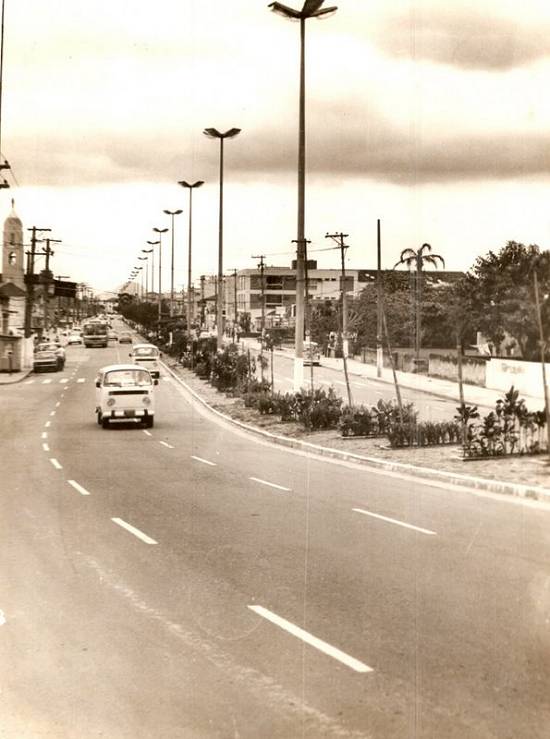 A avenida, vista da ponte sobre o Rio Cubatão, com a torre da igreja matriz à esquerda, por volta de 1985, com a iluminação central instalada numa administração do prefeito José Oswaldo Passarelli: