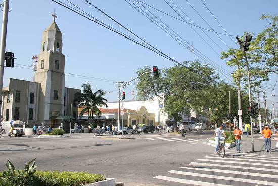 A avenida, com a Igreja Matriz e a Biblioteca Municipal, em 2006: