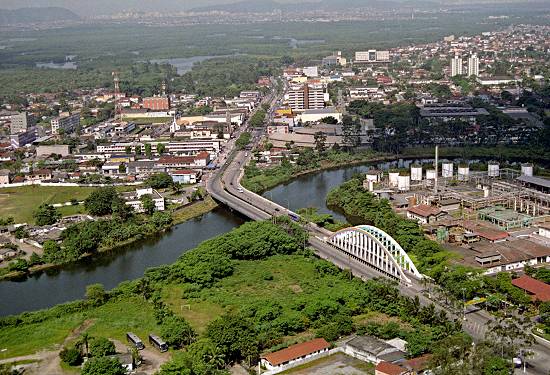 Uma vista aérea da ponte e seu entorno, alcançando Santos no horizonte, em 2005:
