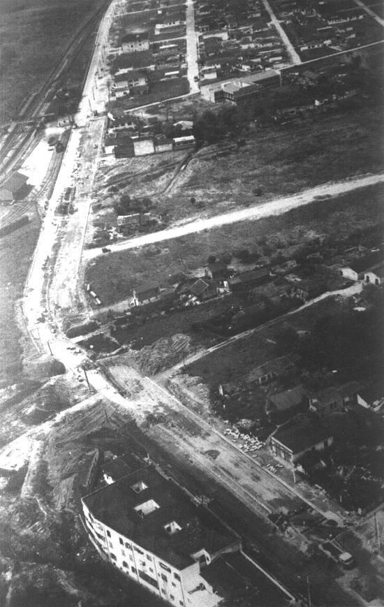 estação ferroviária (à esquerda), o Hospital Municipal (então em construção) à direita e o