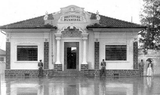 Vista nesta foto da década de 1960, durante uma das muitas manifestações públicas ali realizadas, esta é uma das poucas edificações públicas anteriores à data de emancipação político-administrativa do município: