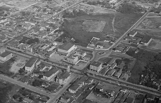 da década de 1970, que tem no centro do primeiro plano a igreja Matriz e sua torre, na Avenida Nove