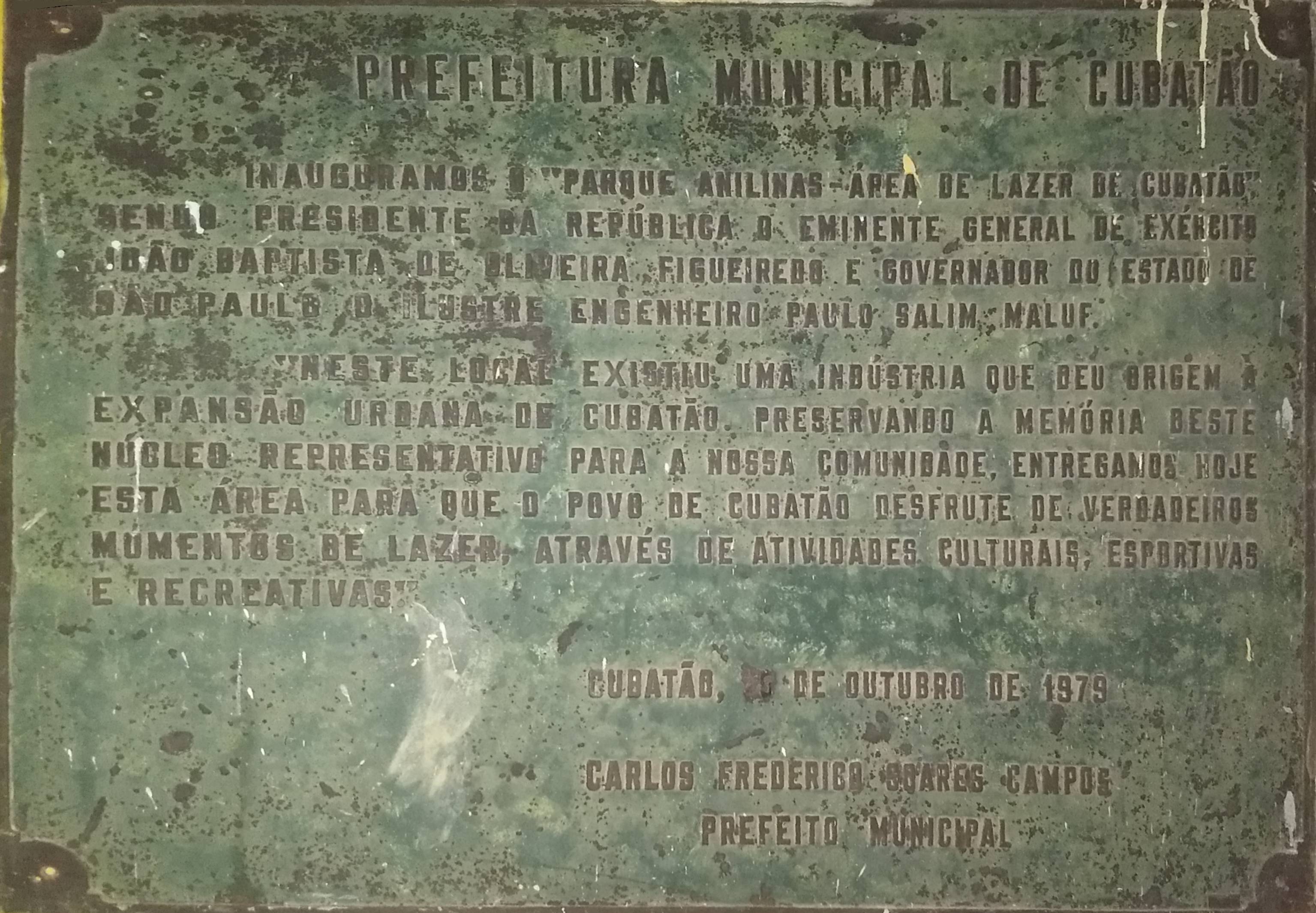 Inauguramos o "Parque Anilinas - Área de Lazer de Cubatão", sendo presidente da República o eminente general de Exército João Baptista de Oliveira Figueiredo e governador do Estado de São Paulo o ilustre engenheiro Paulo Salim Maluf.
