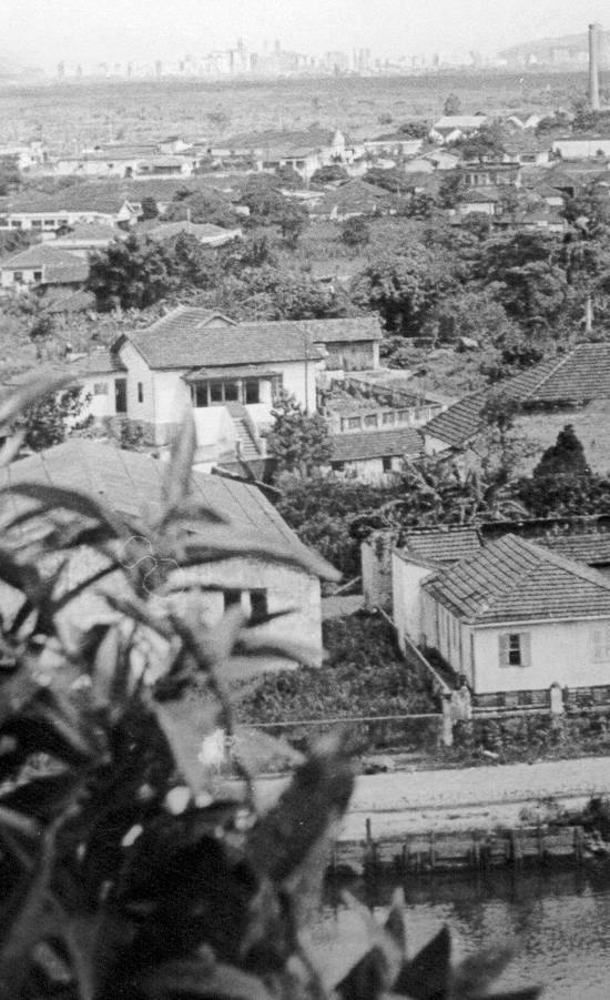 ...a orla da praia de Santos ao fundo, e à direita a chaminé da Anilinas...