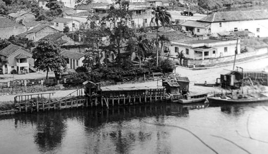 Com o Rio Cubatão em primeiro plano, a onipresente Avenida Nove de Abril ao centro, e ao fundo os primeiros prédios da orla da praia santista, a imagem de uma cidade que começava a sofrer importantes transformações, em 1960: