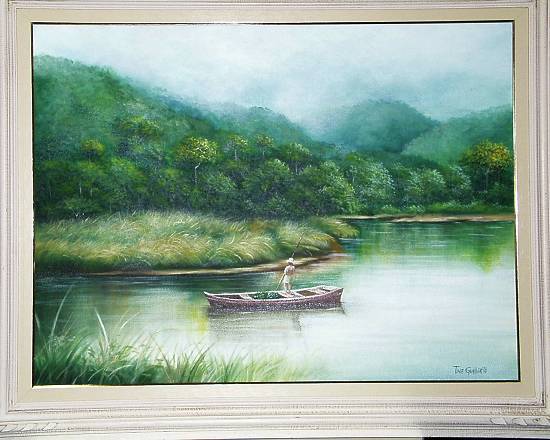 Transporte de bananas pelo Rio Cubatão, cena capturada pela pintora Tina Gualberto: