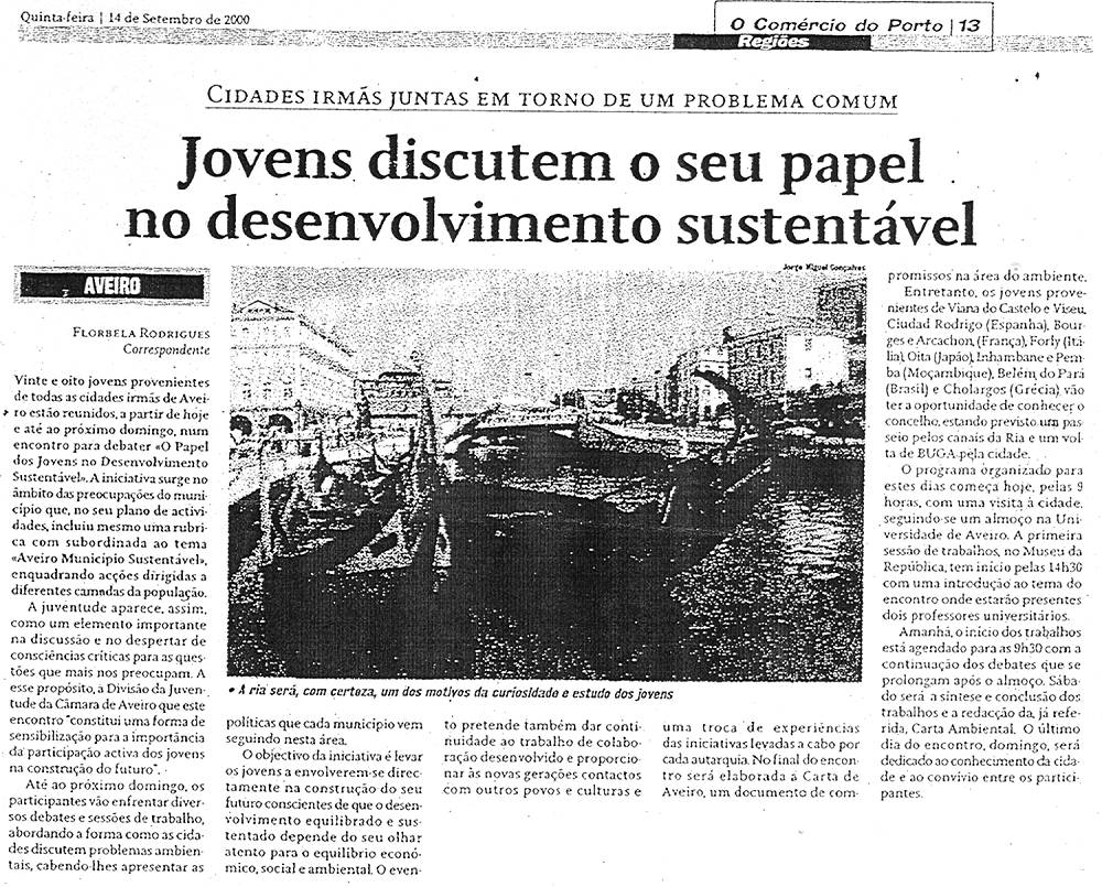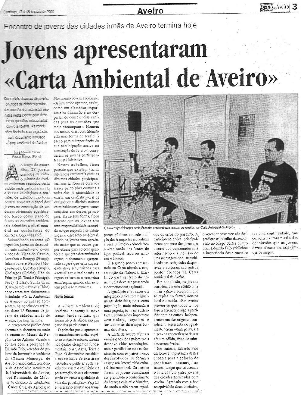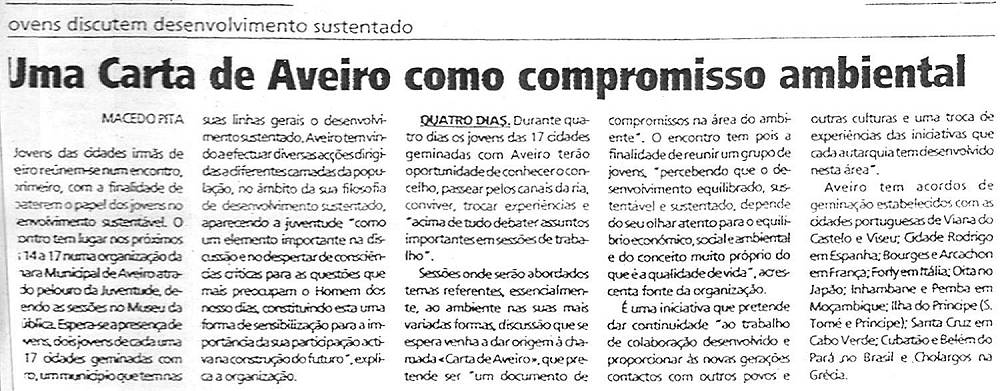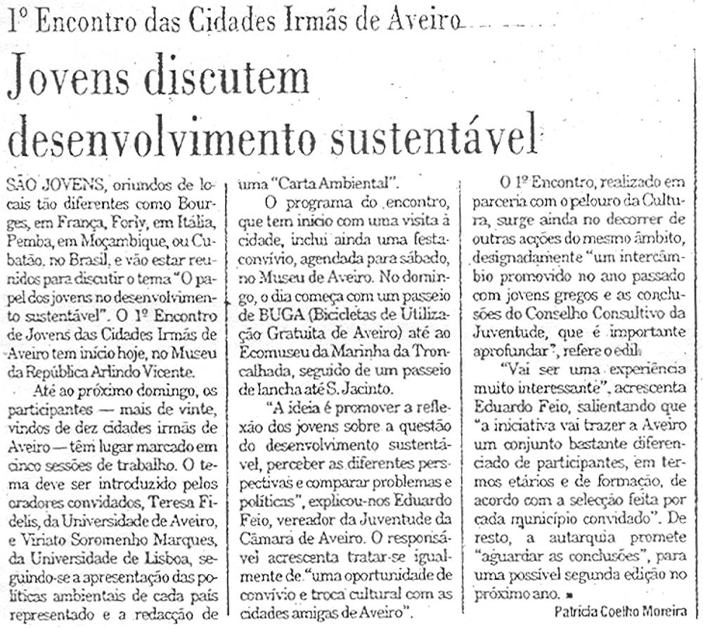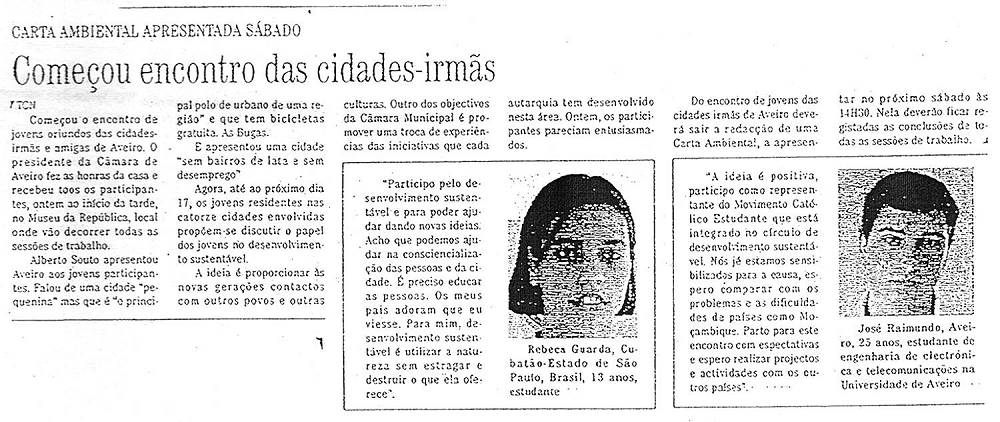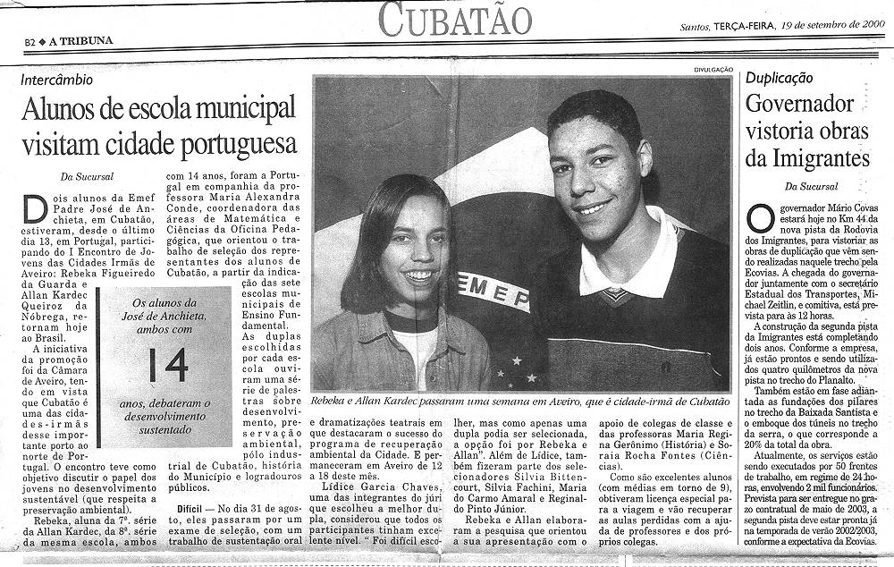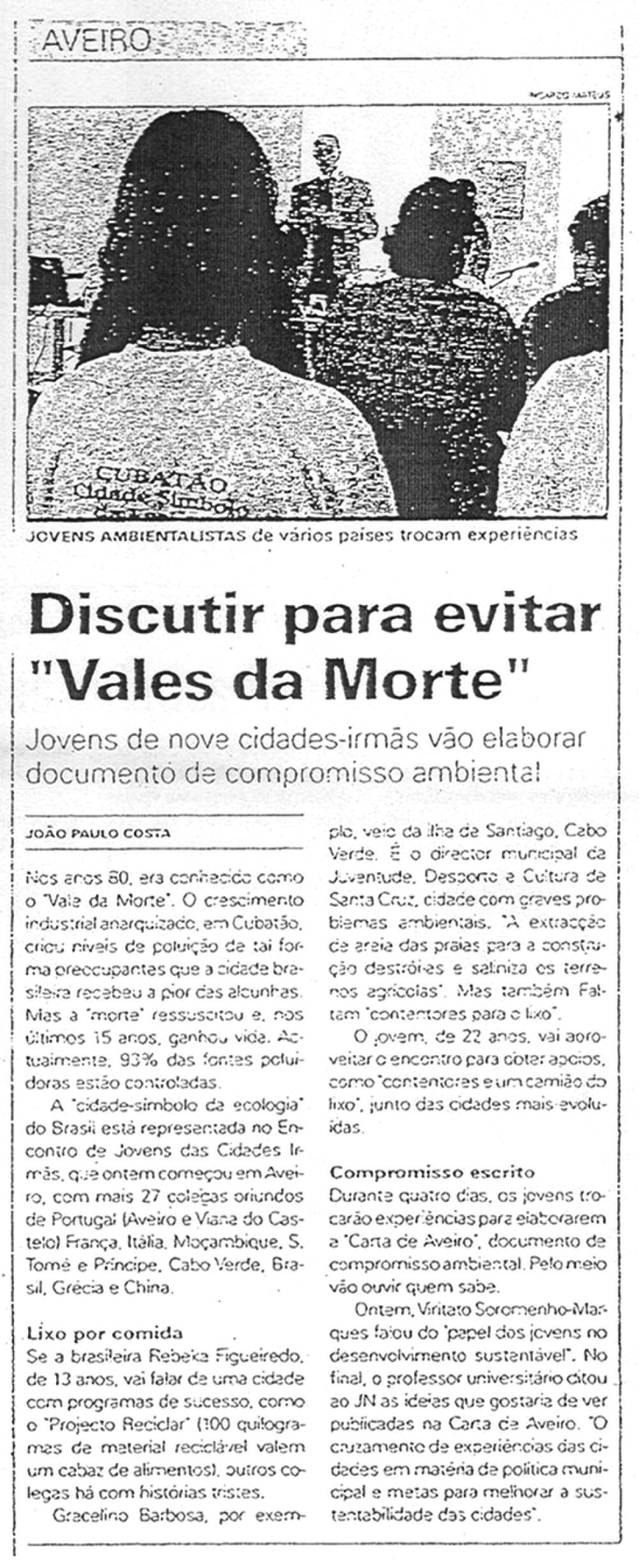 | CUBATÃO DE ANTIGAMENTE Um monumento à amizade (3) Um dos laços mais fortes de irmanamento de Cubatão é com a cidade portuguesa de Aveiro, existindo inclusive um Largo de Aveiro na área central cubatense. Depois da assinatura do acordo (lei 2.086, de 17/9/1992), foi promovido no ano 2000 o 1º Encontro de Jovens das Cidades Irmãs de Aveiro, com a participação de jovens de Cubatão, que apresentaram (em texto e projeção de diapositivos) um trabalho sobre as questões ambientais na cidade. Um deles é Allan Nóbrega, que repassou a Novo Milênio seu acervo do encontro, incluindo as matérias publicadas em jornais portugueses, como O Comércio do Porto e o Diário de Aveiro, e no jornal santista A Tribuna. (Clique >>aqui<< ou nas imagens abaixo para reduzi-las):