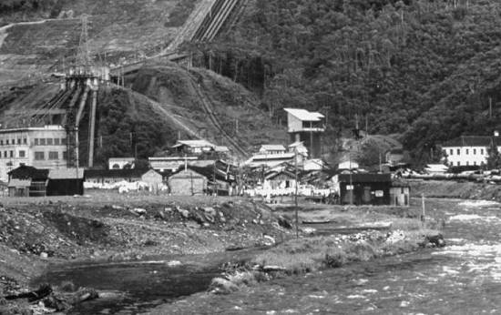 Detalhe da foto acima, mostrando as instalações da hidrelétrica, no sopé da Serra do Mar