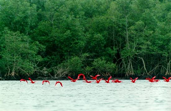 Bando de guarás vermelhos, num mangue de Cubatão