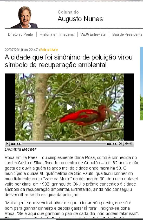 Em 22 de julho de 2010, a edição eletrônica da revista semanal Veja, da Editora Abril, destacou, na coluna de Augusto Nunes, com produção de Domitila Becker, os avanços obtidos no controle ambiental em Cubatão, incluindo a publicação de um vídeo sobre o tema (com apoio de Novo Milênio):