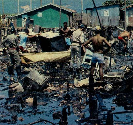 gasolina, que começou a boiar nos mangues, sob os casebres.