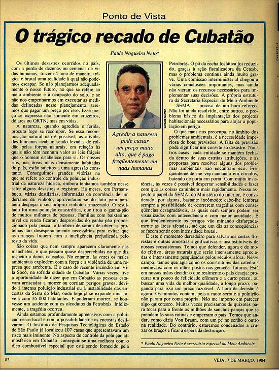 25 bilhões de cruzeiros em 1984, a cidade não tem um único metro de rede de esgotos - ali só existem fossas sépticas, e os detritos despejados pelas indústrias e por uma população de 110.000 habitantes transformam o Rio Cubatão, cujas águas são