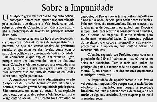 A conivência - política e administrativa - não é específica de Cubatão. Numas cidades mais do que noutras, as favelas gozam de impunidade privilegiada. São intocáveis, em nome do social. Uma explosão como essa que