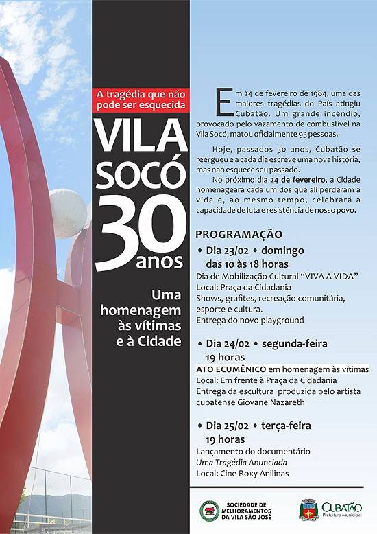 Na semana em que Cubatão relembra os 30 anos de uma de suas maiores tragédias, o incêndio que destruiu a Vila Socó em 1984, um ato ecumênico celebrará a memória das vítimas do desastre. O evento acontece às 19 horas em frente à Praça da Cidadania,