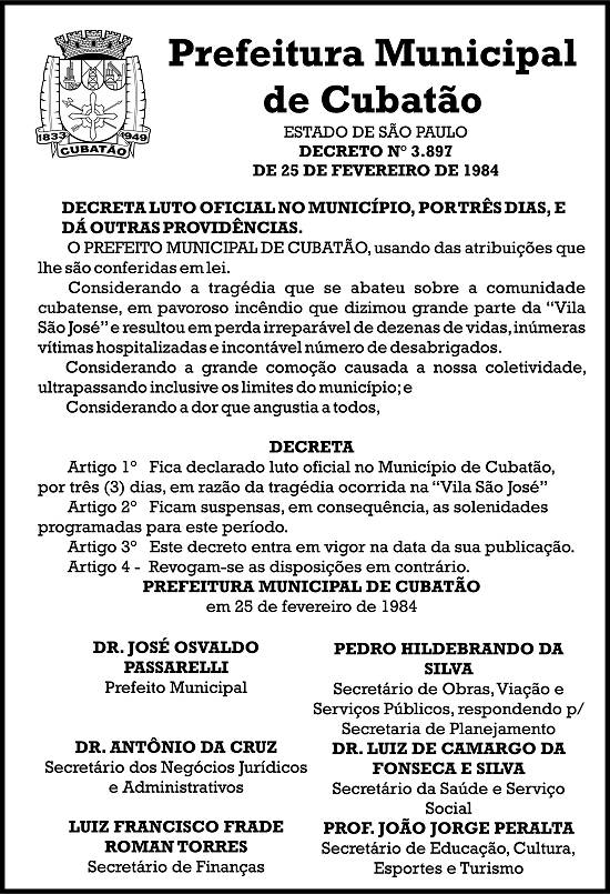 Decreto de luto oficial, publicado pela Prefeitura de Cubatão na página 8 de A Tribuna de 26 de fevereiro de 1984 |