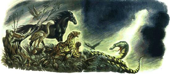 outros bichos já não podiam mais. Mal agüentavam o próprio peso. A cobra percebeu isso e viu que era chegada a hora. Preparou-se então para o