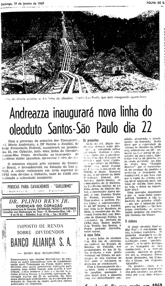 Com a presença do ministro dos Transportes, cel. Mario Andreazza, a E. F. Santos a Jundiaí, da Rede Ferroviária Federal, inaugurará no próximo dia 22, em Cubatão, mais uma linha do Oleoduto Santos-São Paulo, destinada ao transporte de produtos claros (gasolina, querosene e óleo diesel).