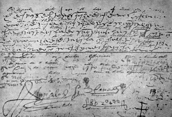 se deteve na ilha e sempre preferiu o continente. Na parte inferior vê-se a assinatura característica de João Ramalho no final da ata de Santo André
