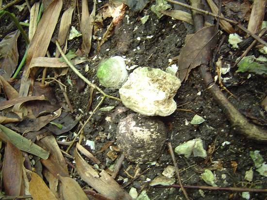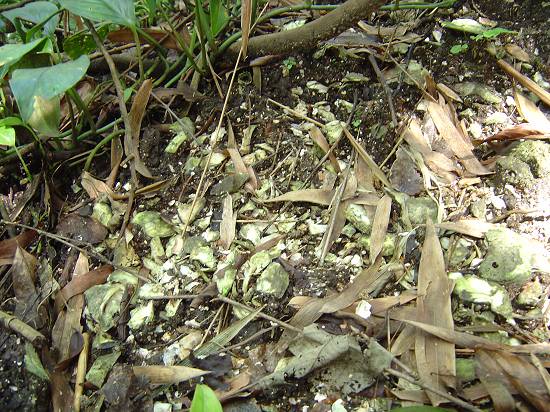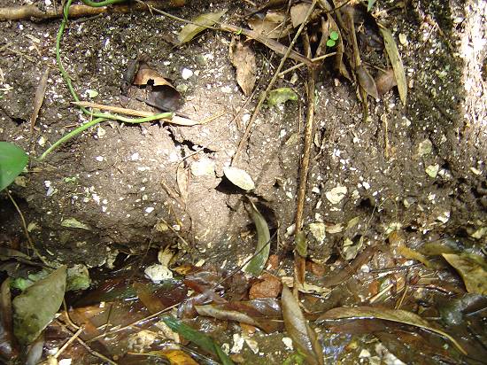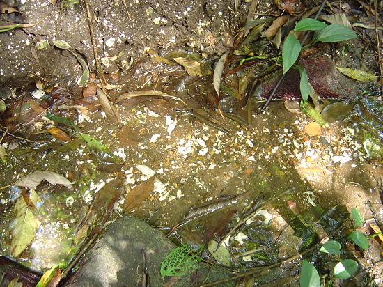 Córrego d'água, erodindo a base do sambaqui e expondo o material (conchas)
