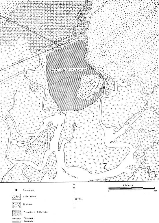 região de Santos, para podermos relacionar as rochas encontradas no sambaqui com o seu lugar de origem, isto é, onde foram coletadas pelo homem.