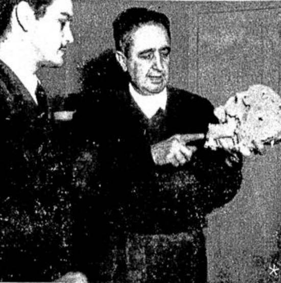 O sr. Paulo Duarte apresenta "miss-sambaqui", um crânio feminino encontrado num sambaqui de Cubatão e que tem mais de 7.000 anos