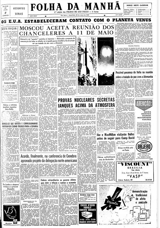 Primeira página da edição e a página com a matéria, em 20 de março de 1959