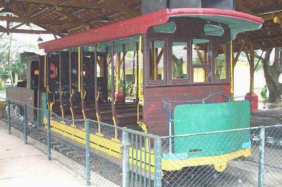 vê uma pequena locomotiva e seu vagão de passageiros, expostos na Cidade da Criança (novo nome do Parque Anilinas, situado no centro de Cubatão), não