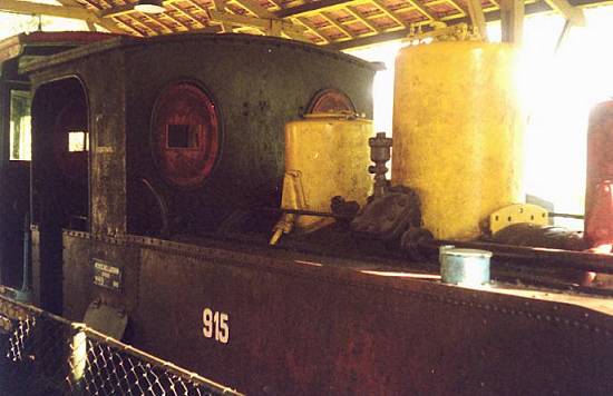 Vista lateral direita da locomotiva 915, estando ainda preservadas a placa e a