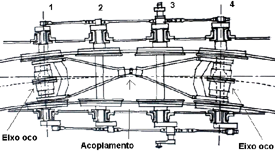 eixo no truque e uma manga exterior maior (eixo oco), onde são fixadas barras que unem os truques através de juntas universais que proporcionam