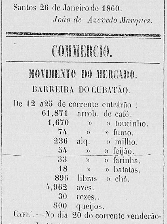 "No ano financeiro de 1836-1837 passaram pela Barreira do Cubatão 433.268 arrobas de açúcar, sendo 239.474 de açúcar branco, 168.134 do redondo e 25.661