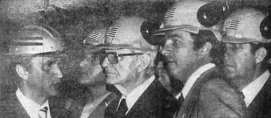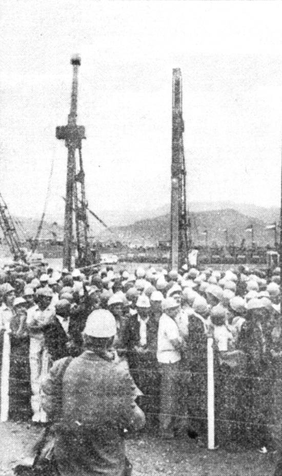 cercado por elementos de segurança, Geisel assistiu ao corte de um lingote bruto - um bloco em brasa - transformado primeiro em uma chapa grossa,