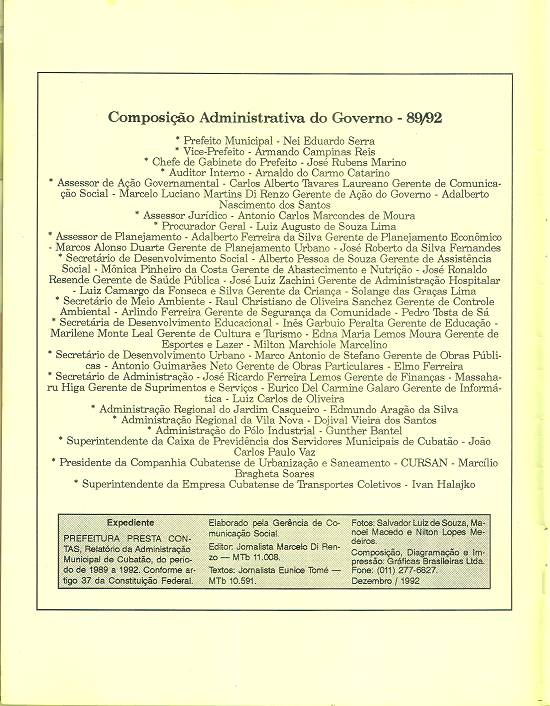 PREFEITURA PRESTA CONTAS, Relatório da Administração Municipal de Cubatão, do período de 1989 a 1992. Conforme artigo 37 da Constituição Federal. Elaborado pela Gerência de Comunicação Social.