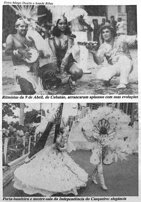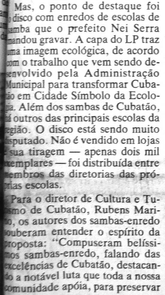 espírito da proposta: "Compuseram belíssimos sambas-enredo, falando das excelências de Cubatão, destacando a notável luta que toda a nossa