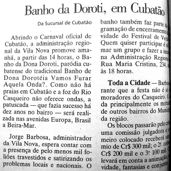 Dona Doroti - Novidade mesmo aconteceu no carnaval de 1991: quando em Santos a tradição do Banho da Dona Dorotéia já começava a esmorecer, um grupo de carnavalescos cubatenses, que participava dessa folia, e continuava a festa no Jardim Casqueiro, resolveu iniciar no município uma paródia desse desfile, que ganhou o nome de Banho da Dona Doroti.