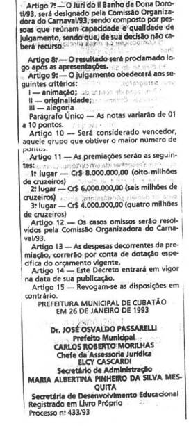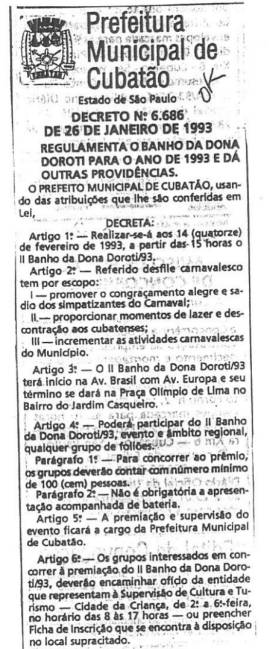 Em 26 de janeiro de 1993, o Banho da Dona Doroti era regulamentado para aquele ano, pelo decreto 6.686, definindo que a festa seria realizada no dia 14 de fevereiro seguinte, como sendo o II Banho da Dona Doroti/93. Ele teria início na Av. Brasil com Av. Europa e terminaria na Praça Olímpio Lima, no bairro do Jardim Casqueiro. Era considerado pelo decreto como evento de âmbito regional, e para concorrer aos prêmios os grupos de foliões deveriam contar com um mínimo de cem pessoas.