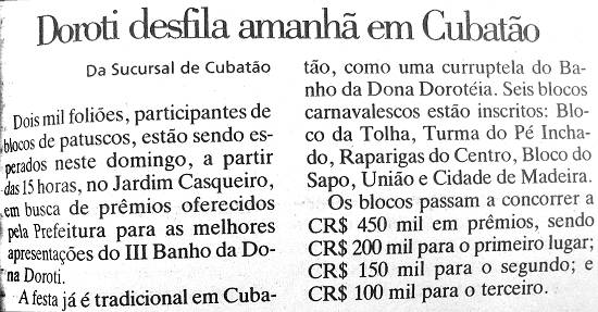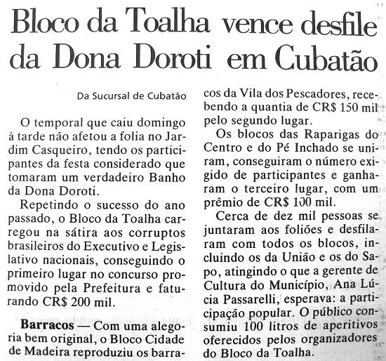 No ano seguinte, era registrado pelo jornal A Tribuna, em 9/2/1994, que "o temporal que caiu domingo à tarde não afetou a folia no Jardim Casqueiro, tendo os participantes da festa considerado que tomaram um verdadeiro Banho da Dona Doroti". Venceu o concurso o Bloco da Toalha, carregando na sátira aos corruptos brasileiros.