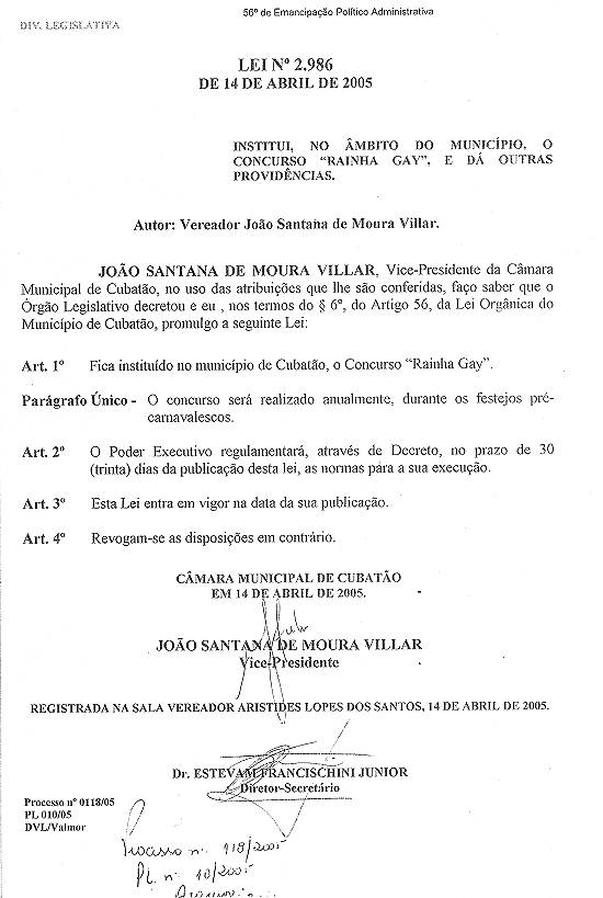 Parágrafo único. Para Rei Momo do Carnaval de Cubatão de 1986, fica mantido o nome de Silvio de Andrade Filho, em homenagem ao folião
