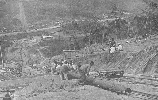 Trabalhos da construção do oleoduto. O plano inclinado (trilho na serra) é na bitola