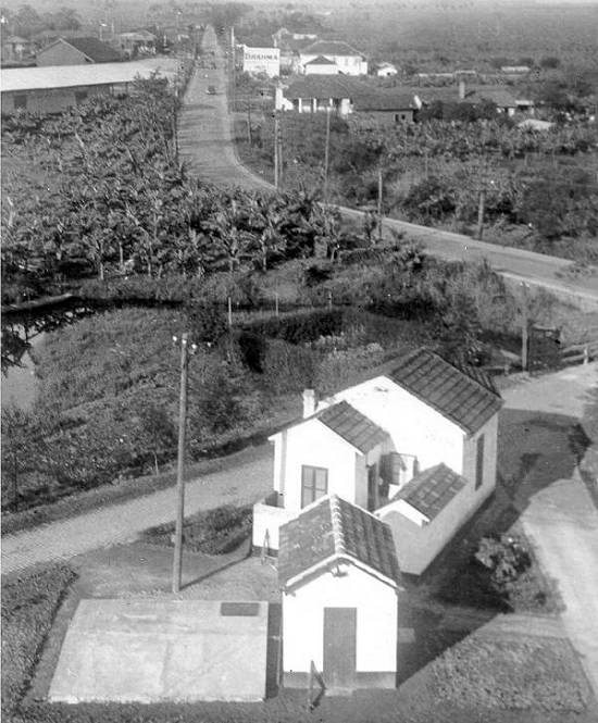 Via Bandeirantes/Nove de Abril, cerca de 1950, e em primeiro plano instalações da Cia.