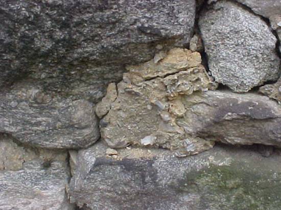 Ruínas de uma construção de pedras com amarração de conchas de sambaquis, preservadas