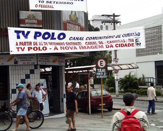 Faixas pelas ruas de Cubatão, em agosto de 2002, anunciam o surgimento da TV Pólo