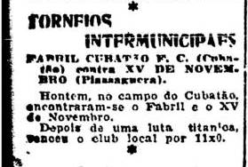 TORNEIOS INTERMUNICIPAIS - Fabril Cubatão F. C. (Cubatão) contra XV de Novembro (Piaçagüera) - Ontem, no campo do Cubatão, encontraram-se o